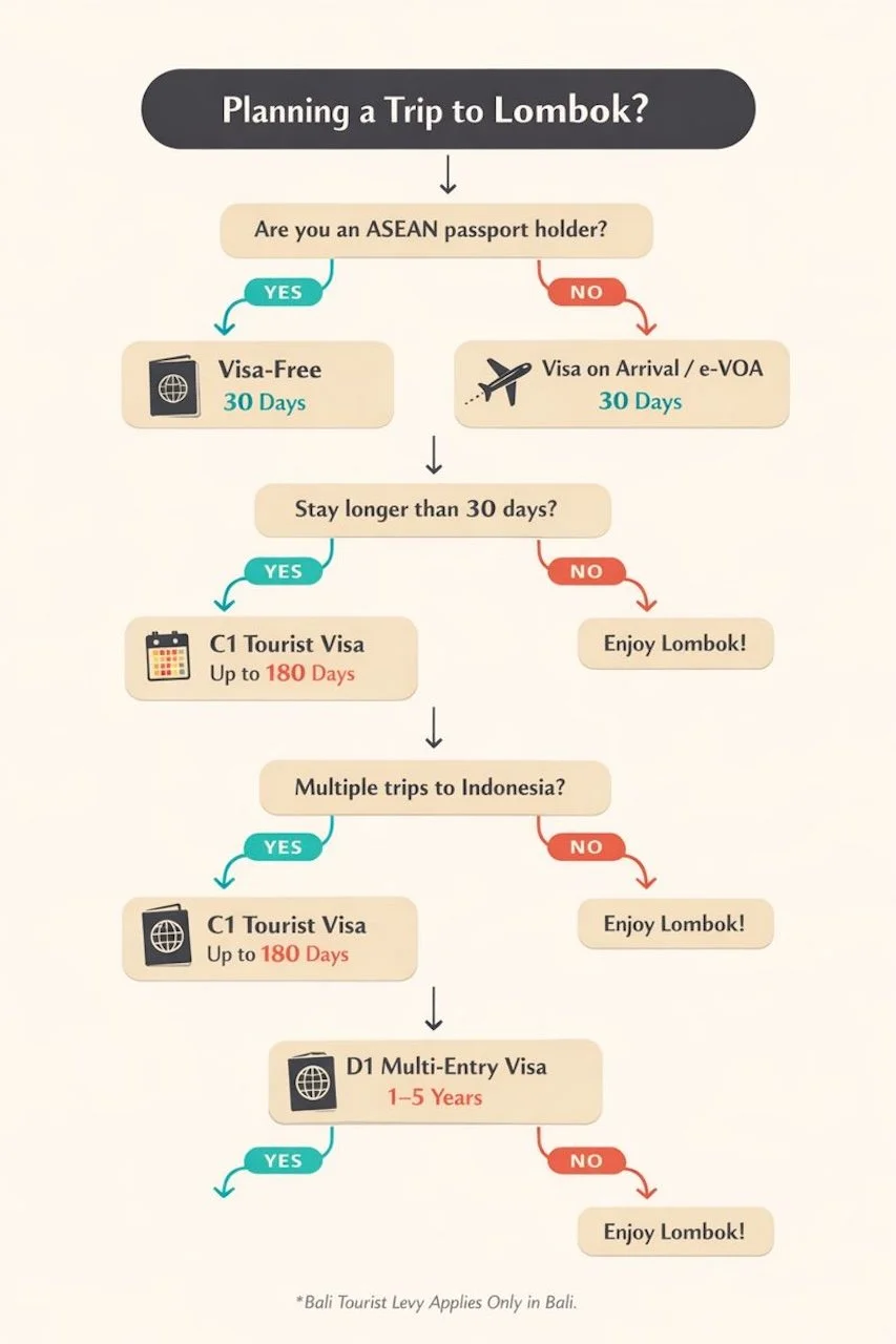 Visa rules are the same across Indonesia, including Lombok and Bali. The only difference travellers usually notice is that Bali has an additional local tourist levy, while Lombok does not.